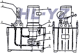 1、超高压组合阀(CZ4M/8C) 2、手动换向阀 3、压力表 4、电机 5、空气滤清器 6、手把 7、高压柱塞泵 8、低压齿轮泵 9、放油螺栓