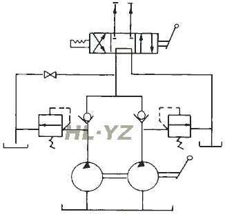 3、双级泵站:低压时,高,低压泵同时供油,可获得较大的输出流量。高压时,低压泵经卸荷溢流阀自动空载回油。减少功率消耗。
